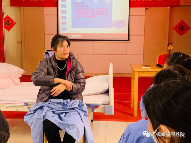 为进一步加强我院养老护理员康复知识、技能,提高我院康复护理水平,近日,我院再次邀请了周主任为我院全体护理员进行老年康复培训。此次培训的内容主要为卧床老人的下肢锻炼,指导偏瘫老人自主穿衣服、穿裤子等。