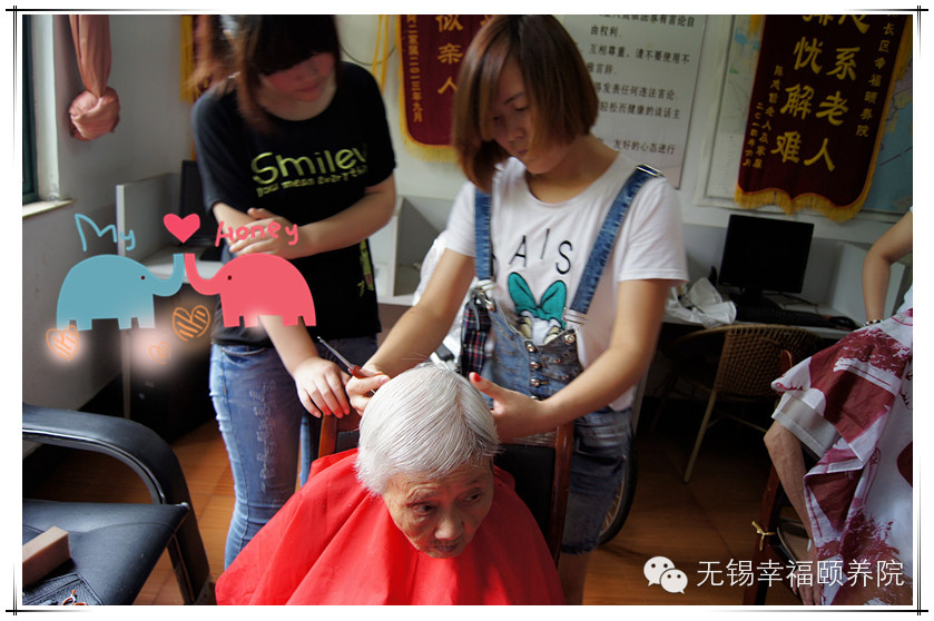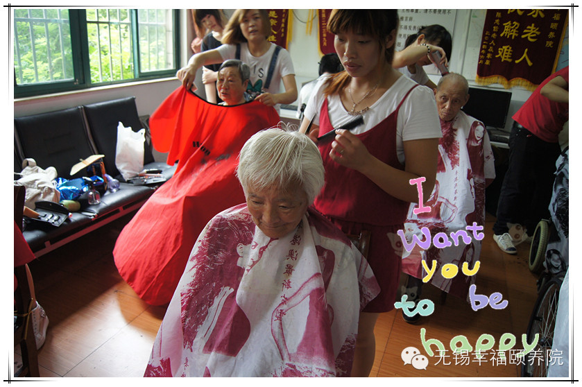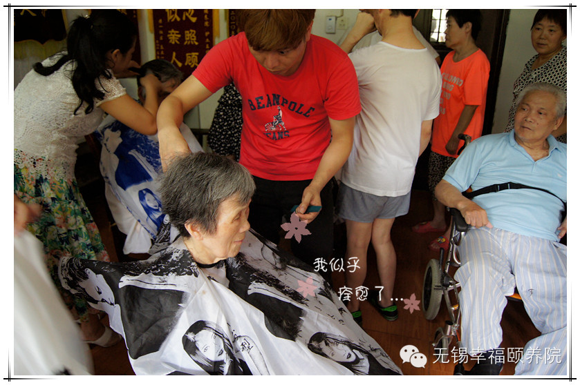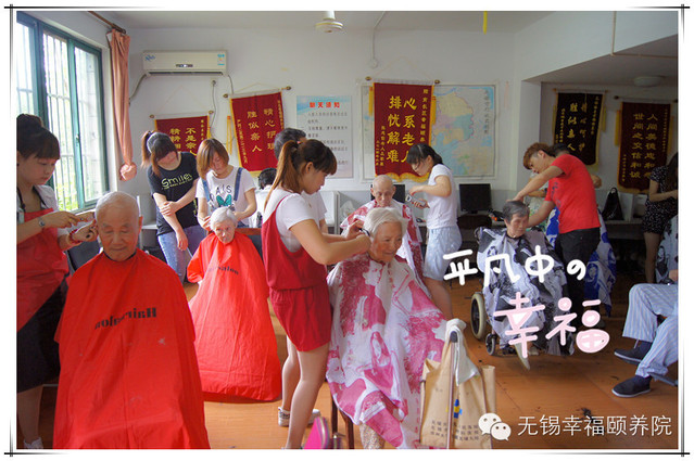 7月12日上午,我们院里的老人们非常高兴,因为中浪美容美发职业培训学校的爱心志愿者们来幸福颐养院为阿公阿婆们剪头发。