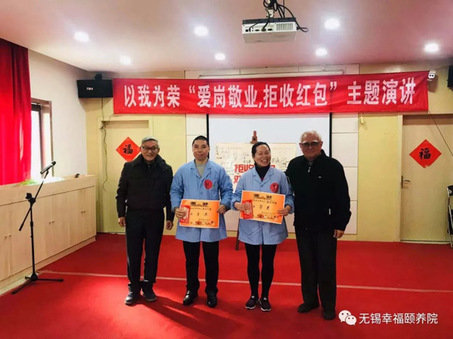 为响应梁溪区民政局《关于 “5.9”护工违规收受老人家属红包事件》的文件,提高我院护理员的职业道德与职业素养,激发护理员爱岗敬业的工作热情,争创良好的工作氛围,12月20日幸福院的护理员、老人欢聚一堂,举办了“以我为荣,爱岗敬业,拒收红包”主题活动。