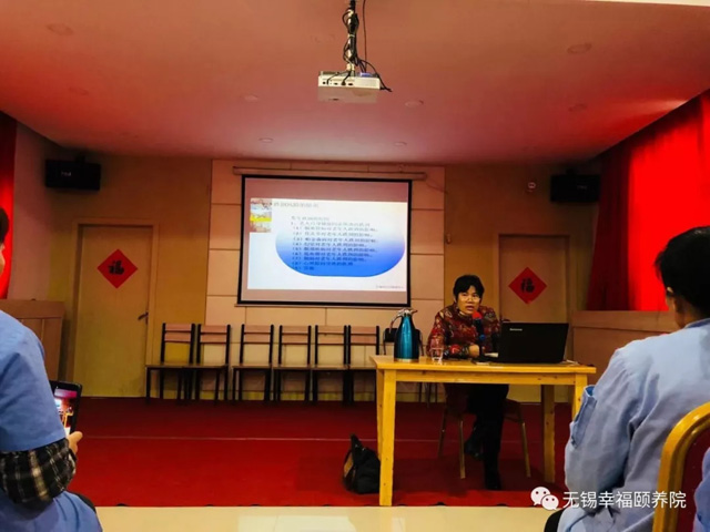 幸福颐养院是一家省级示范性医养结合的养老机构,由于老人衰老导致意识模糊、失去定向力、判断力差、记忆力减退等,增加了老人的安全问题,威胁老人的身体健康。为了提高服务质量,特聘请了专业老师给大家讲解老人安全防范方面的知识,培训过程采用PPT讲解和实验演示相结合的方式。本次培训由我院护理部主任、护士长和护理员们利用业余的时间来听课,给自己充电,认真加强学习专业知识。