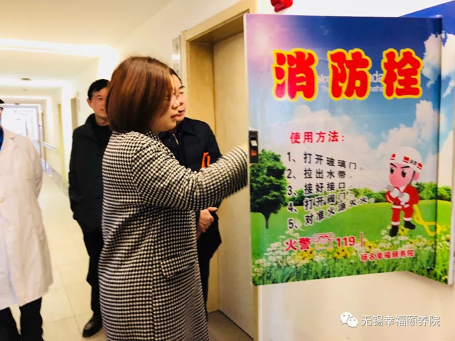 2月27号上午,梁溪区卫计委张副局长一行来我院安全工作指导,深入了解老人们的日常生活状况,仔细询问了我院管理人员消防安全自救能力掌握情况。查看了食堂易发消防安全事故场所和疏散逃生出口是否畅通,消防台账、消控室、微型消防站、充电桩、应急照明灯、灭火器等消防设施是否配备齐全。检查中还现场介绍了如何预防火灾及灭火器操作方法和如何报警、逃生、自救等基本常识。以此全面提高老人的安全意识和应变能力。