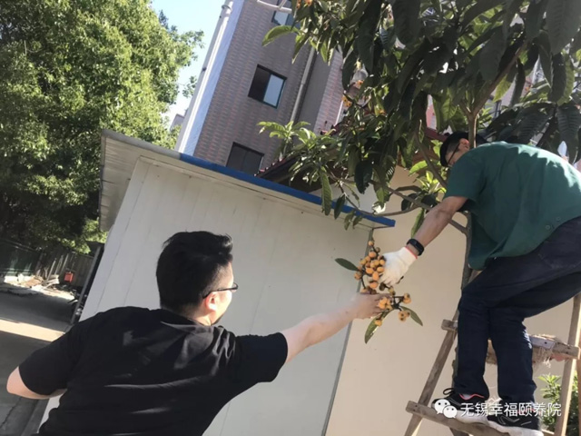 在我们幸福院的院子里有一颗枇杷树,夏天到了,枇杷一天天长大,一天天成熟。它的外皮先是青绿色,逐渐变青中带黄,最后变得黄澄橙的。枇杷树上挂满了枇杷,它们犹如一盏盏金灿灿的小灯笼,夹杂在绿叶中,真像是金果压枝,灿若群星。为了给老人们品尝最新鲜的枇杷,今天一早,在吴院长的带领下,亲手采摘一颗颗诱人的枇杷,希望给老人们吃到甘甜爽口、充满鲜嫩的汁水的枇杷。