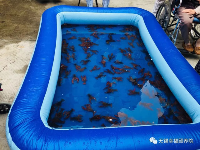 钓龙虾比赛开始了,老人们都热情高涨。众多龙虾游走在水池中,老人们争先恐后,亲自上阵,从最近的龙虾下手,放线、钩虾、提线一气呵成。这些小家伙闻食出洞,夹着肉块跟着绳子就被吊出了水面,龙虾们有傻傻上钩的,也有机灵逃跑的,整个比赛充满了懊恼声和欢呼声。最终,张牙舞爪的龙虾们在老人们强大的攻势下"节节败退",只得束手就擒。“老顽童们”玩得不亦乐乎,仿佛回到了童年。