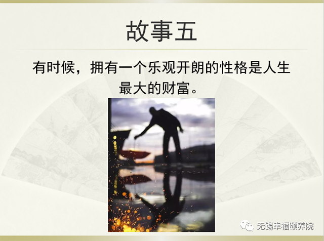 我院的老人黄群老师听了故事后向大家讲述了自己的故事,黄群老师是一个追求生活品质的人,她的故事告诉大家:"人到老了不要计较太多,照顾好自己的生活,安度晚年最重要"。
