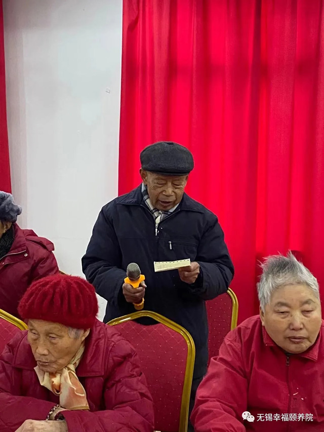 茶话会上每位老人朗诵出自己亲自写的新春贺词